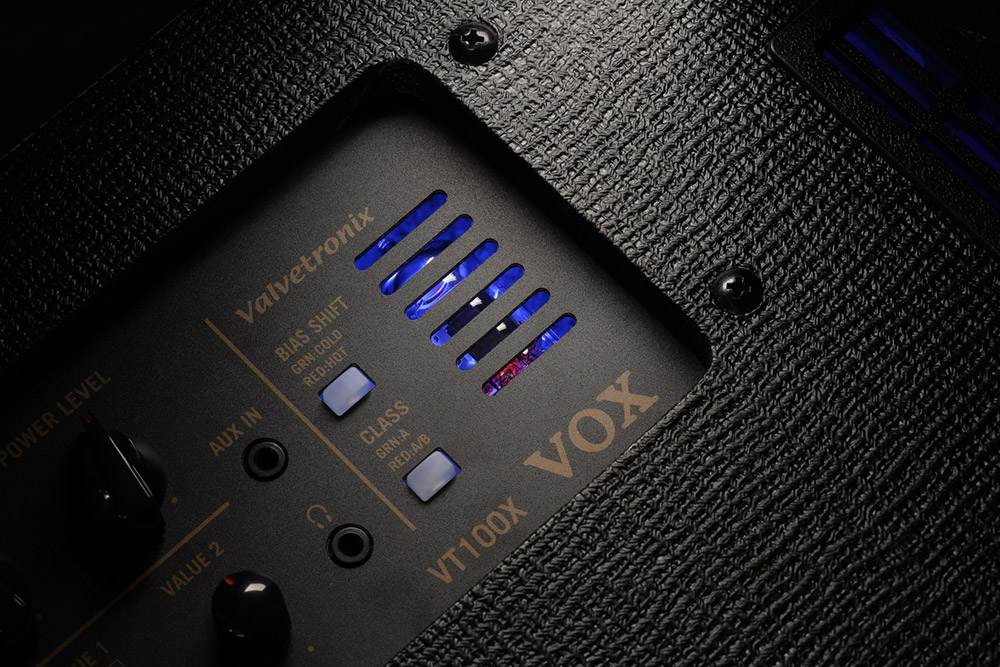 Com 100 Watts de potência, o VT100X é mais poderoso amp dentre os novos Valvetronix Series. Projetado para o palco ou no estúdio, este combo compacto é perfeito para qualquer local. A tonalidade de um amp valvulado real é fielmente reproduzida por um alto-falante VOX de 12", enquanto o conjunto de controles intuitivos permite que você personalize o VT100X ao seu gosto. Estes amplificadores combinam a nova e sofisticada tecnologia de modelagem com pré-amp valvulado (1x12AX7), que reproduz uma distorção única, extrema sensibilidade e resposta característica de amplificadores valvulados clássicos. O novo algoritmo de modelagem recria os circuitos analógicos dos amplificadores valvulados mais cobiçados do mundo e permite aos usuários ajustar a estrutura de ganho, alternar entre a classe A e AB e ajustar as "bias" do amplificador em tempo real. Os 13 efeitos clássicos baseados nos pedais mais emblemáticos e que combinados com os 11 modelos de simulação de amps produzem timbres realísticos.